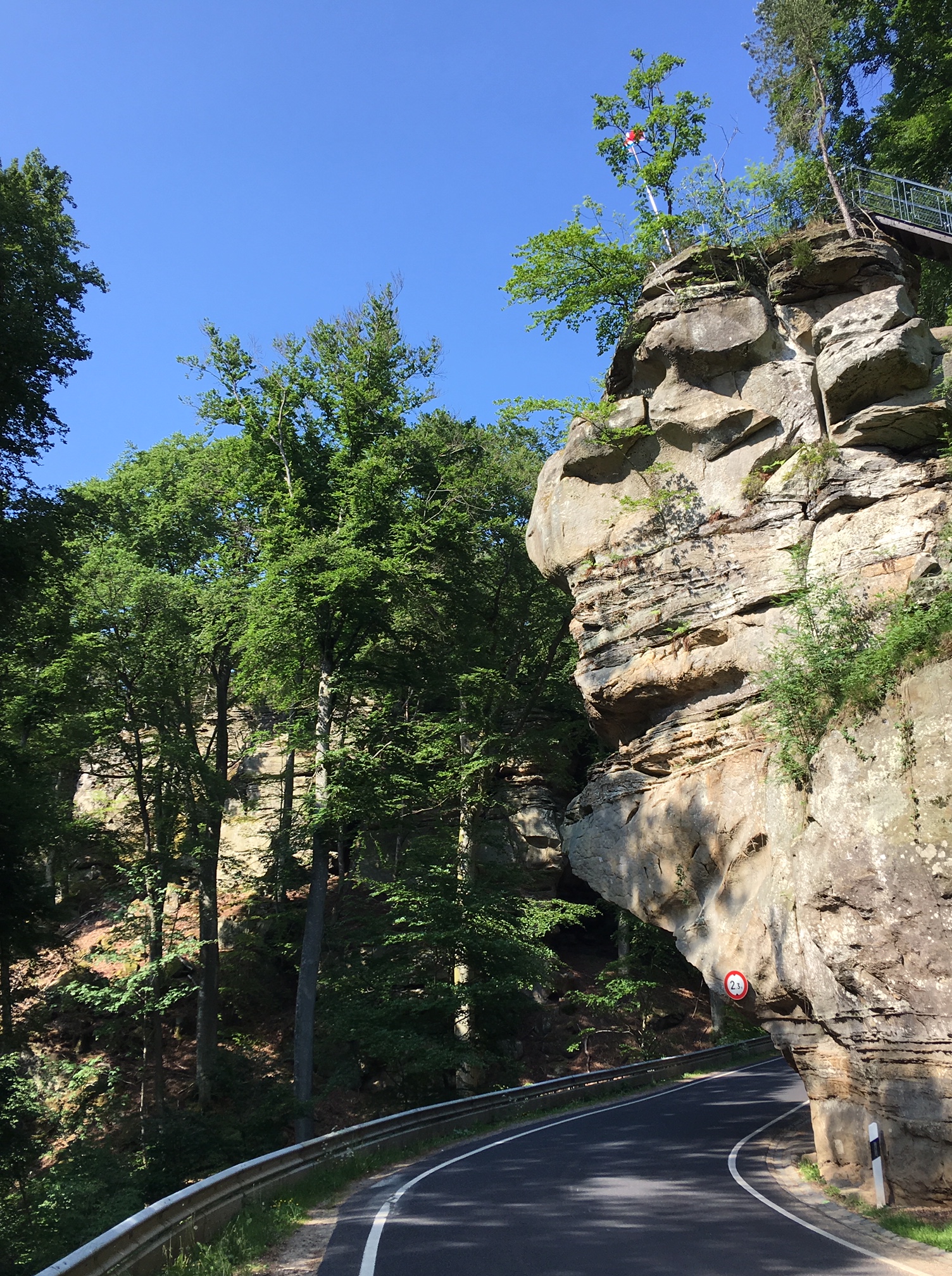 After getting quite lost along the way and backtracking for the better part of an hour, I also passed Presdigstuhl – with several rock formations that you can climb using metal staircases for some incredible views of the forest while standing on a rock balanced over a working road!